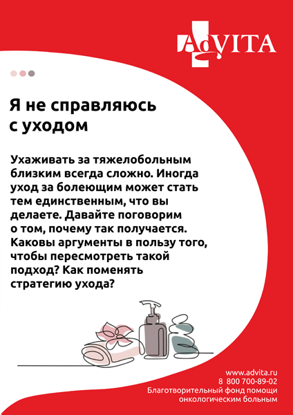 В этих буклетах подробно описаны ответы на вопросы, которые часто беспокоят ухаживающих за тяжело болеющим человеком. Если после прочтения у вас останутся или появятся вопросы по организации ухода, получению обезболивания, терапии неприятных симптомов и др., пожалуйста, обратитесь в паллиативную службу фонда AdVita по телефону 8 800 700-89-02. Телефон работает 24/7. Подробнее о работе паллиативной службы можно узнать здесь.