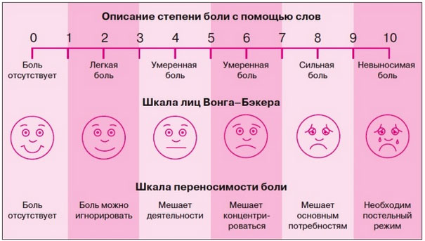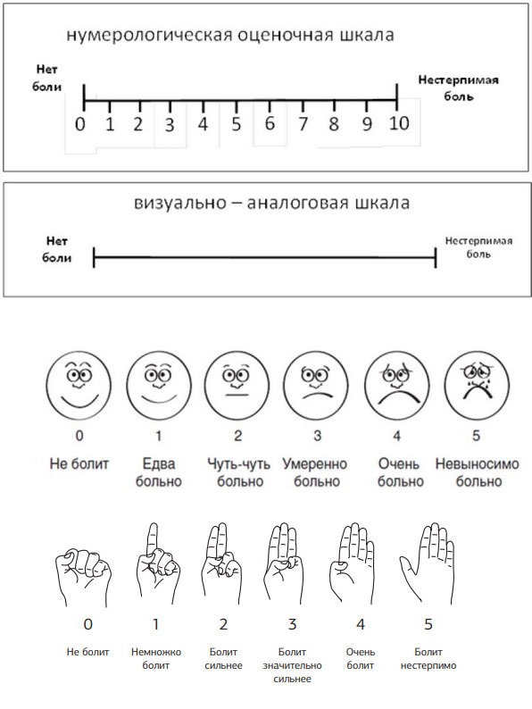 «Золотой стандарт» при оценке боли — самостоятельная оценка пациентами своего состояния. Для того чтобы провести оценку интенсивности боли используют различные шкалы: визуальные, словесные и нумерологические.