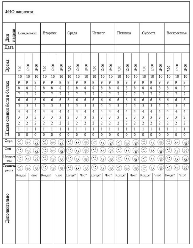Регулярно проводить оценку интенсивности боли и вовремя отследить ее изменение помогают дневники оценки боли. Пациенту необходимо самостоятельно или с помощью близких заполнять дневник несколько раз в день через равные промежутки времени.